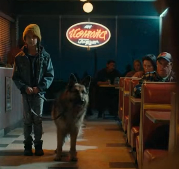 Grant hesitated, then reached into his pocket with shaking hands. He pulled out Ethan’s small blue hoodie. Max’s nose twitched, his ears shot forward. His entire posture changed from calm to laser focused. The girl whispered. He found the trail. People in the diner turned, watching silently. A couple stood up. Someone gasped. Grant felt hope flare inside him for the first time in two days.