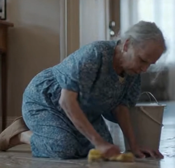 The smell of cleaning chemicals hit me immediately. In the hallway, on her knees, scrubbing the floor with slow, painful movements, was a woman wearing a worn-out house dress. Her shoulders were hunched, her hands trembling as she pushed the rag across the tiles.