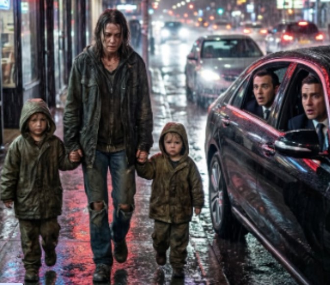 By the entrance of a shabby convenience store, a woman knelt on the wet pavement, clothes clinging to her thin frame, hair soaked and stuck to her cheeks. Beside her stood two children—twins, maybe nine or ten—huddled together, shivering, tiny hands stretched out toward strangers rushing by. Their paper cup rattled with the occasional coin.