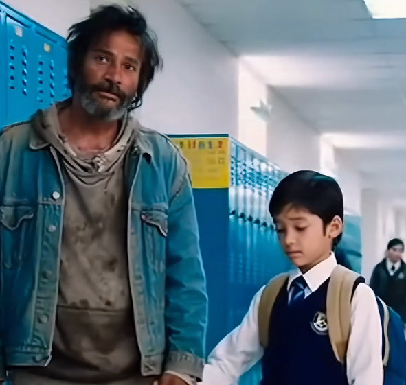 The boy wore a perfectly pressed school uniform, clean white shirt, navy trousers, polished shoes, and a backpack that still smelled new. His hair was neatly combed. His posture straight. He looked exactly like every other student in the building—except for the way his small hand clutched the beggar’s fingers, as if afraid to let go.