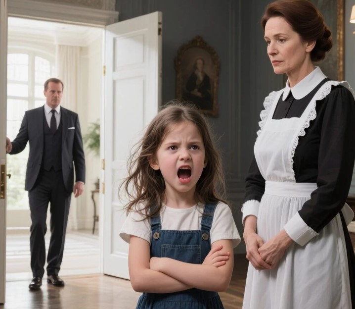 Lily’s door was slightly open. Through the crack, he saw the new maid standing still beside the bed, her face calm but firm. Lily’s cheeks were red, her small fists trembling. On the carpet lay a broken vase, water soaking into the fibers.