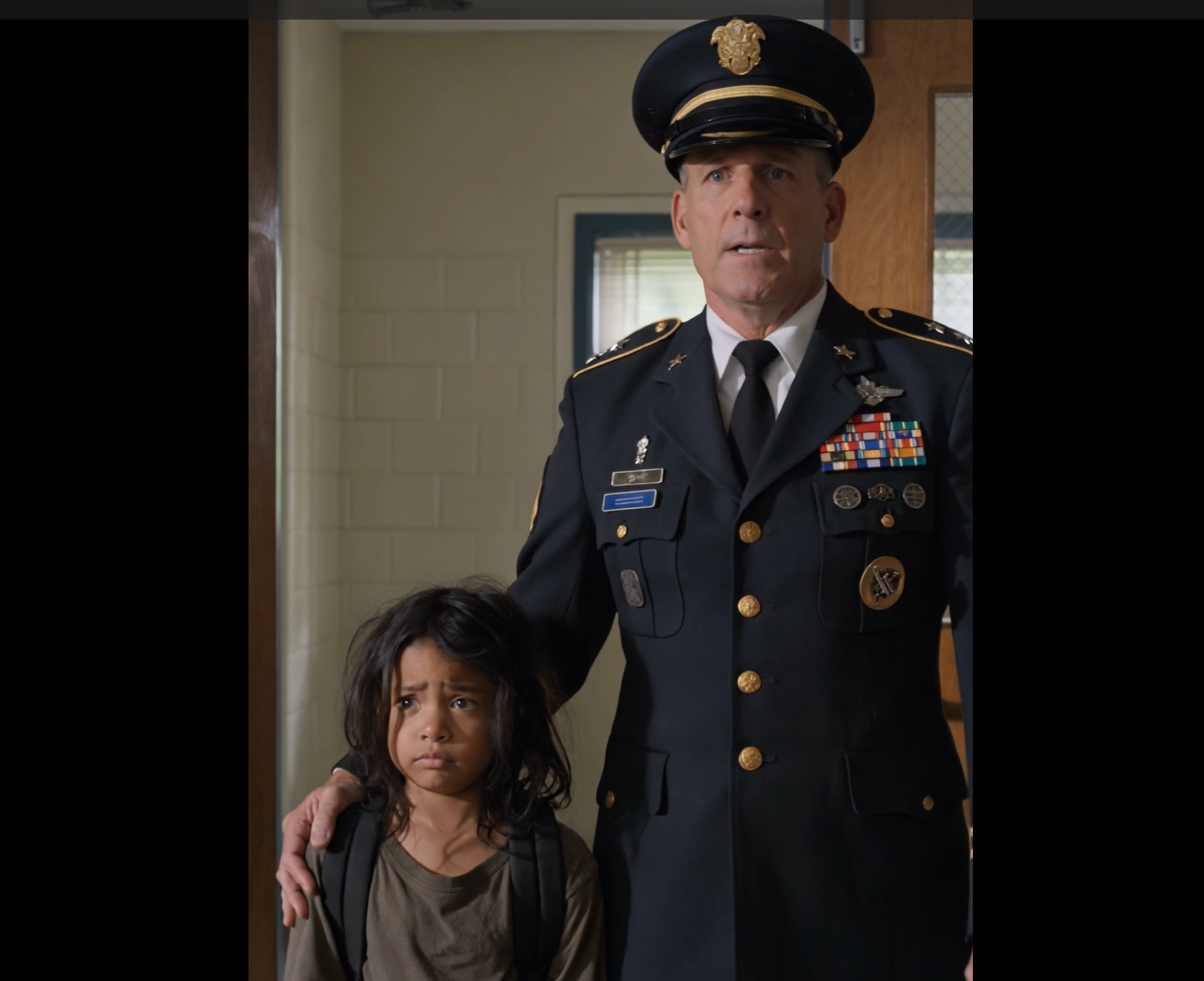 The Colonel knelt down and looked into his daughter’s eyes. He brushed the tear from her cheek with his thumb, and smiled — the soft, broken smile of a man holding himself together for someone smaller than himself.