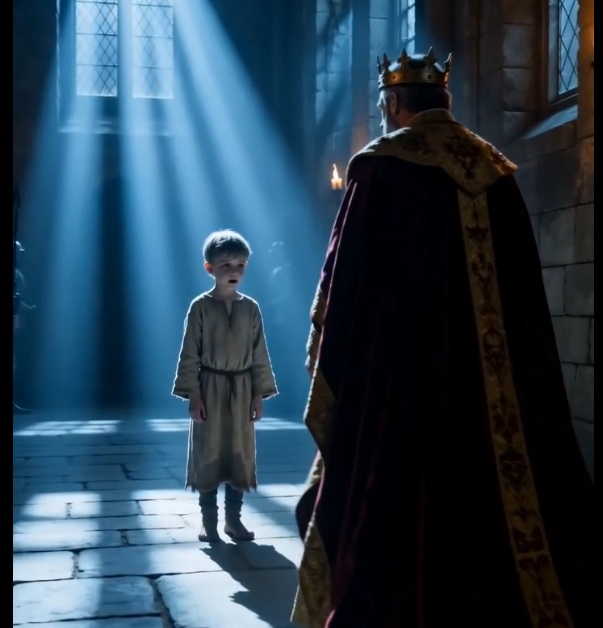 He could not have been more than ten years old. His tunic was simple — the kind a commoner’s child might wear — and his face was pale, his dark hair falling soft around his ears. He stood perfectly still, hands at his sides, and he was looking at the King.